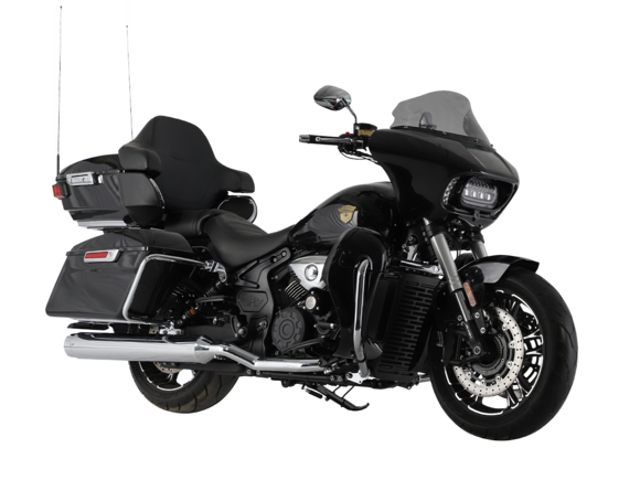 GROZA Traveller 800 – роскошный круизёр, который создан для суперкомфортного перемещения на любые расстояния. Он имеет современный, брутальный дизайн с мощным обтекателем, характерной светодиодной головной оптикой и монументальными хромированными глушителями.Двухцилиндровый V-образный двигатель объёмом 800 см3 мощностью 61 л.с. при высоких показателях динамики и отличном крутящем моменте способен разгонять аппарат до 160 км/ч. Привод на ведущее колесо осуществляется ремнём знаменитой марки USA Gates. Жидкостная система охлаждения не допустит перегрева мотора даже на самых непростых маршрутах.На мотоцикл установлены литые алюминиевые диски диаметром 17 дюймов. Ширина передней покрышки – 140 мм, задней – 200 мм. С неровностями дороги эффективно справляются телескопическая вилка перевёрнутого типа спереди и маятник с двумя амортизаторами сзади. Вилка имеет 7 ступеней регулировки, что обеспечивает лёгкую перестройку на различные режимы езды. Для всего класса круизёров такая опция – большая редкость. Эффективное и безопасное замедление с любых скоростей обеспечивают гидравлические дисковые тормоза спереди и сзади от компании NISSIN.Мотоцикл оснащён мощной музыкальной системой с четырьмя 6,5-дюймовыми динамиками, двумя штатными видеорегистраторами спереди и сзади, тремя грузовыми кофрами общим объёмом 120 литров, развитой спинкой для пассажира, массивными дугами и “валенками”, снабжёнными открывающимися вентиляционными шторками и небольшими грузовыми ёмкостями. Из других приятных мелочей в допоборудовании мотоцикла стоит выделить подогрев ручек, датчики давления в шинах и USB-порт.Мотоцикл сочетает в себе отличные технические характеристики, богатое оснащение, комфорт и надёжность, что позволяет вам ощутить настоящую свободу, отправившись на нём в любое путешествие.