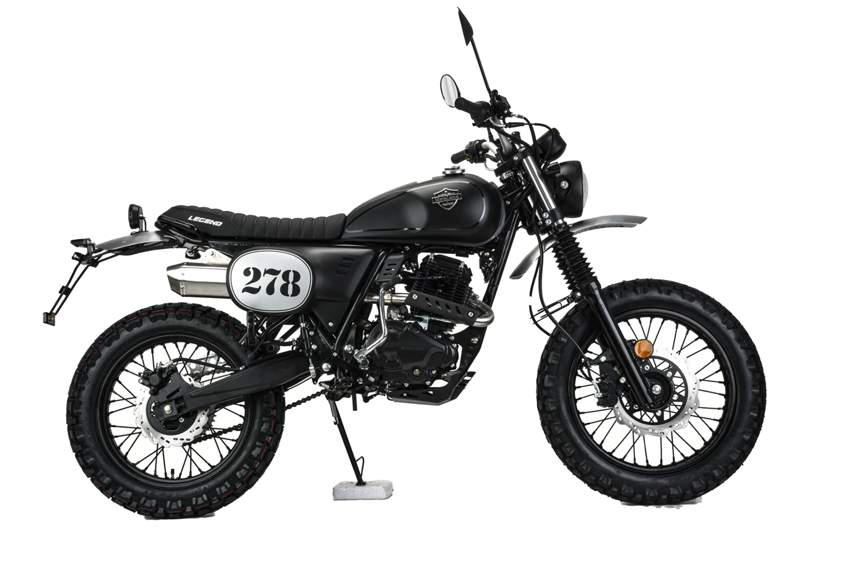 Представляем Вашему вниманию ЭКСКЛЮЗИВНУЮ НОВИНКУ 2023 года – мотоцикл двойного назначения LEGEND 250!LEGEND 250 – является стильным мотоциклом с достойными характеристиками в бюджетной категории. Дизайн мотоцикла выполнен в гоночном ретро стиле, укомплектованный современной LED оптикой, приборной панелью, титановым выхлопом, креплением номерного знака и прочими канонами современности.Низовой покладистый мотор, классическая посадка, мягкое рифлёное сидение и спицованные колеса – всё это способствует комфортному управлению по асфальтированным дорогам и пересеченной местности.LEGEND 250 был спроектирован как универсальный мотоцикл, для райдеров любых возрастов. На нём будет комфортно в городе, посёлке, деревне, поле и даже в лесу.Мотоцикл оснащен двигателем 172FMM-5 (баланс. вал) с 5 ступенчатой коробкой передач, мощностью 21 л.с. или же 15,4 кВт/8800 RPM. Впуск оснащен карбюратором Keihin PZ30, выпуск – титановым выхлопом от Motoland.Установлена металлическая защита картера, алюминиевые крылья и защита цепи, усиленный толстостенный руль и усиленная 520 цепь.Ходовая часть состоит из телескопической длинноходной вилки диаметров 37 мм и задним моноамортизатором.Покрышки шириной 4.1 и 4.6 дюйма (обод перед. 78мм - 110/90/18 и бод задний 98мм - 120/90/17) с универсальным рисунком протектора (высота шашки 11 мм) установлены на прочных металлических ободах с алюмин. ступицами. Такое сочетание позволяет быть уверенным в хорошем сцеплении с дорогой.Передний увеличенный тормозной диск в сочетании с качественной тормозной системой позволяет максимально уменьшить тормозной путь.Топливный бак в 11 литров и экономичный мотор с расходом в 2,5 л./100км. Позволяют проезжать более 400 километров без дозаправки.