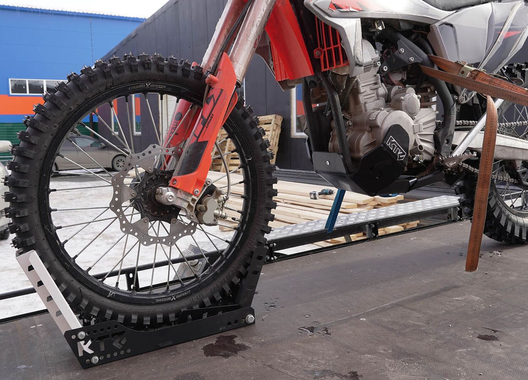 Универсальная ловушка для переднего колеса мотоцикла (мотоловушка) предназначена для транспортировки и хранения кроссовых и эндуро мотоциклов. Позволяет быстро и надёжно зафиксировать переднее колесо, обеспечивая устойчивость и предотвращая смещение в процессе перевозки.
