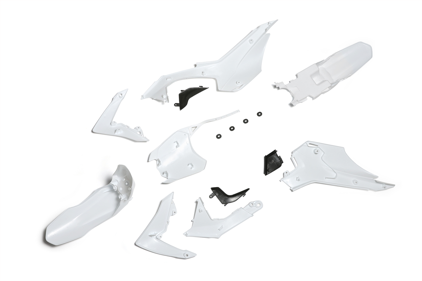 • Полный комплект пластика для питбайков и среднеразмерных эндуро мотоциклов с типом пластика CRF110 нового образца. Новый комплект оснащён обновлённым дизайном и изменённой формой заднего крыла (хвоста). Возможна установка на модели со старым образцом пластика при небольшой доработке заднего крыла.