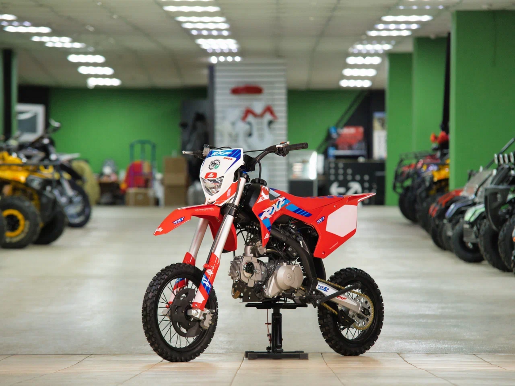 Apollo RXF Open - надёжный питбайк, разработанный инженерами Apollo во Франции. Модели RXF Open оснащены вилочными подвесками V-one Volt Suspension длиной 810 мм. Амортизатор V-One последнего поколения Volt Suspensions, был специально разработан, чтобы позволить раме извлечь выгоду из лучшего сцепления при использовании на бездорожье! Новый фильтрбокс устанавливается на всю линейку RXF. Особенностью этого фильтрбокса является съемный выдвижной ящик, требуется меньше 30 секунд, чтобы сменить воздушный фильтр! RXF Open оснащен тормозными дисками размером 220 мм спереди и 190 мм сзади для достижения максимально эффективного торможения. Модель RXF теперь стандартно оснащены цепями 428 вместо 420 у моделей конкурентов. Модели RXF Open оснащены надежным 4 тактным одноцилиндровым двигателем YX 125 кубиков и комплектуются колесами 14/12.У нас Вы можете купить этот питбайк с бесплатной доставкой по РФ и гарантией до года. Также его можно приобрести в рассрочку или в кредит.