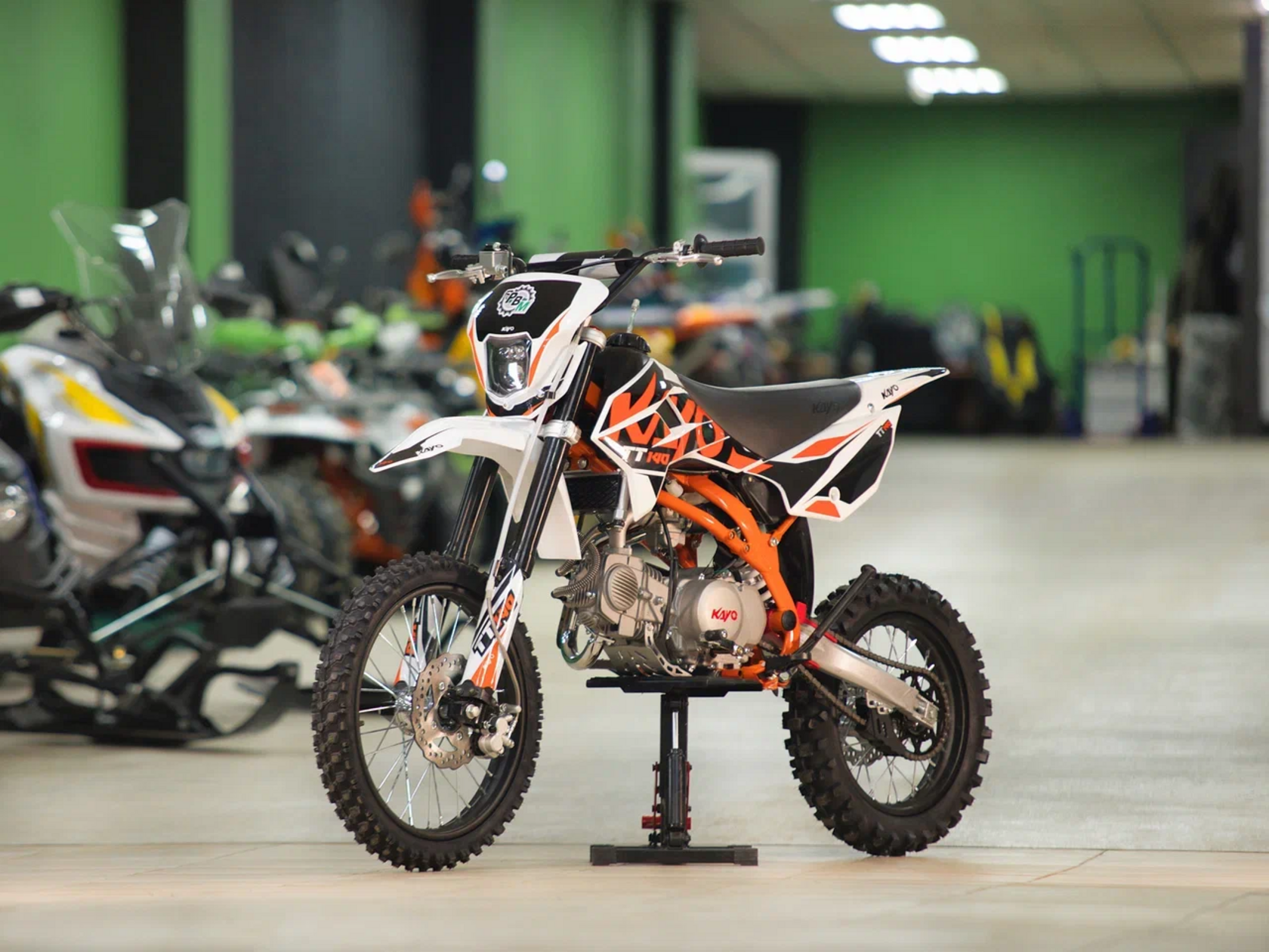 Питбайк KAYO Basic TT140 KRZ – версия для прогрессирующих и хороший старт для тех, кто готов перейти от базовых тренировок к более сложным заездам. Подходит для лёгкого эндуро и оттачивания мастерства.Одноцилиндровый 4-тактный двигатель воздушно-масляного охлаждения YX1P56FMJ объёмом 140 см3, выдаёт 13 л.с. Карбюратор NIBBI PE19 обеспечивает бесперебойную работу техники в самых жёстких условиях эксплуатации, простоту и лёгкость в обслуживании, а также неприхотливость к качеству топлива. Питбайк имеет вместительный топливный бак на 5,5 л. Питбайк оснащён механической 4-ступенчатой коробкой передач с формулой “N-1-2-3-4”. Запуск двигателя осуществляется с помощью рычага кикстартера.Мотоцикл имеет вес всего 73 кг. Усиленная рама из хром-молибденового сплава и подвеска позволяют эффективно амортизировать удары при езде по неровностям и препятствиям на трассе. Передняя подвеска — телескопическая вилка перевёрнутого типа длиной 770 мм, задняя — моноамортизатор длиной 360 мм. Оба компонента подвески являются нерегулируемыми. Рама и пластик являются собственной разработкой производителя. Мотоцикл оснащён классическими стальными спицованными колёсами диаметром 17 дюймов спереди и 14 дюймов сзади. Эффективное и безопасное замедление с любых скоростей обеспечивают гидравлические дисковые тормоза. Высококачественная износостойкая резина с развитым протектором отлично держит дорогу на различных типах покрытия.Питбайк оснащён яркой светодиодной линзованной фарой, позволяющей кататься в тёмное время суток.Если вы ищете послушный, компактный, динамичный и красивый питбайк, считайте, что вы его нашли. Это один из лучших мотоциклов для обучения и первых шагов в эндуро и мотокроссе. Он отлично подойдёт как для гонок на трассе, так и для обычного катания по пересечённой местности.