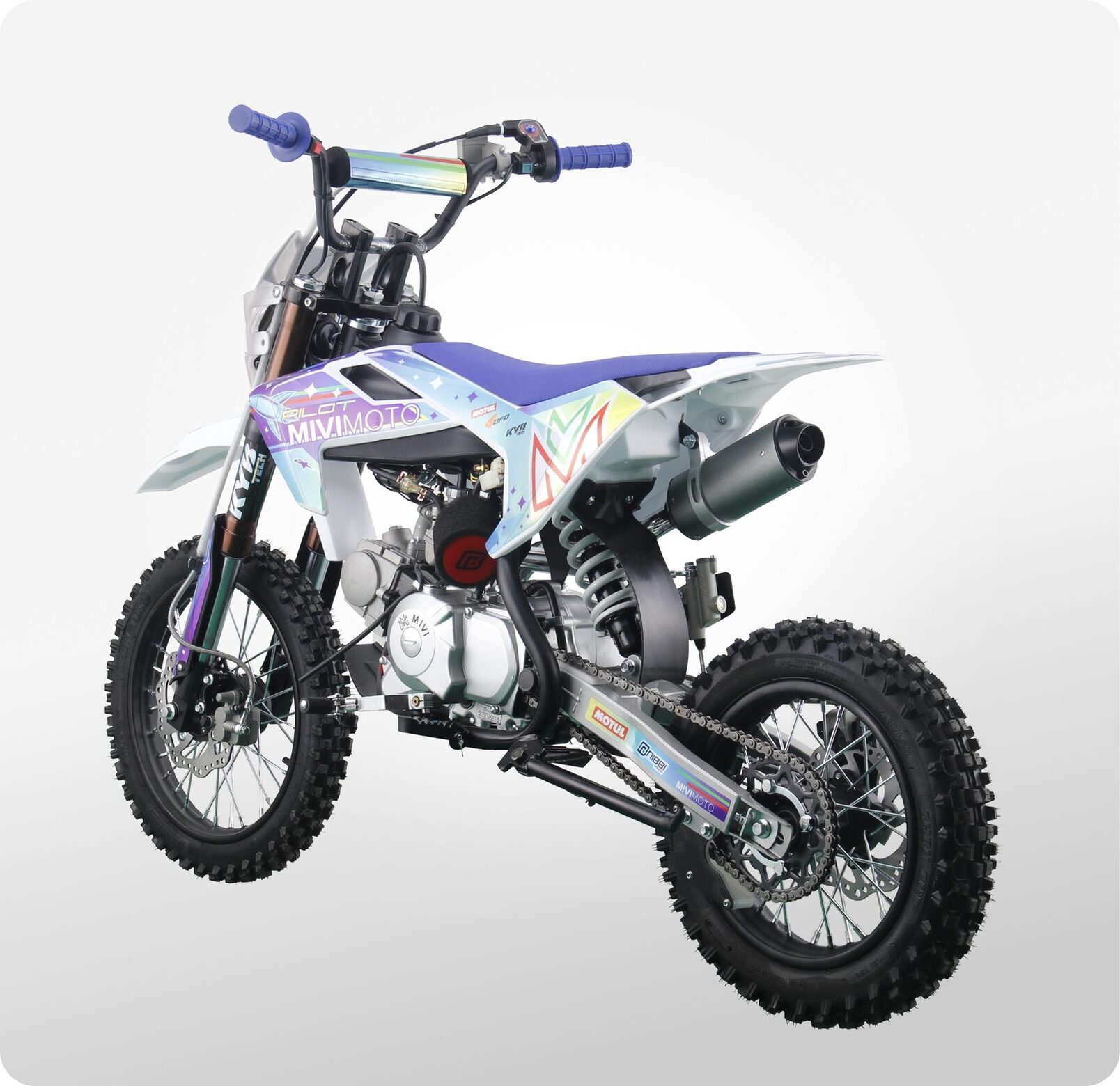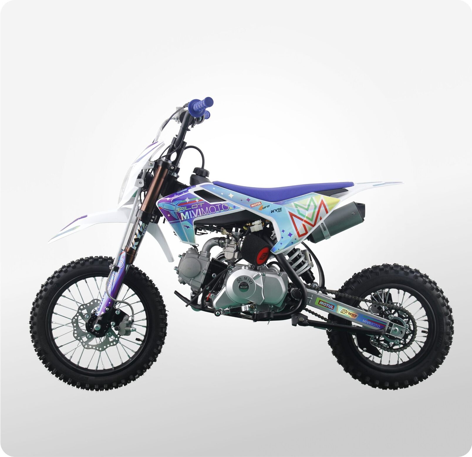 MIVIMOTO PILOT 125 — идеальный питбайк для новичков и молодых гонщиков. Легкий, компактный и надежный, он создан для тех, кто делает первые шаги на трассе и стремится развивать свои навыки. Модель сочетает в себе продуманный дизайн, простоту управления и уверенную динамику.- Четырехтактный одноцилиндровый двигатель объемом 125 см³ / 8 л.с. с воздушным охлаждением в сочетании с карбюратором Nibbi Racing PE17 обеспечивает эффективную подачу топлива и стабильную работу в любых условиях. Двигатель оснащен электростартером и полуавтоматической трансмиссией. Все это позволяет управлять техникой даже самым юным любителям мотоциклов.- Спереди питбайк оснащен перевернутой телескопической вилкой KYB tech, сзади — моноамортизатором с регулируемой жесткостью. Конфигурация обеспечивает плавный ход, хорошую отработку неровностей и комфорт при прыжках и резких маневрах.