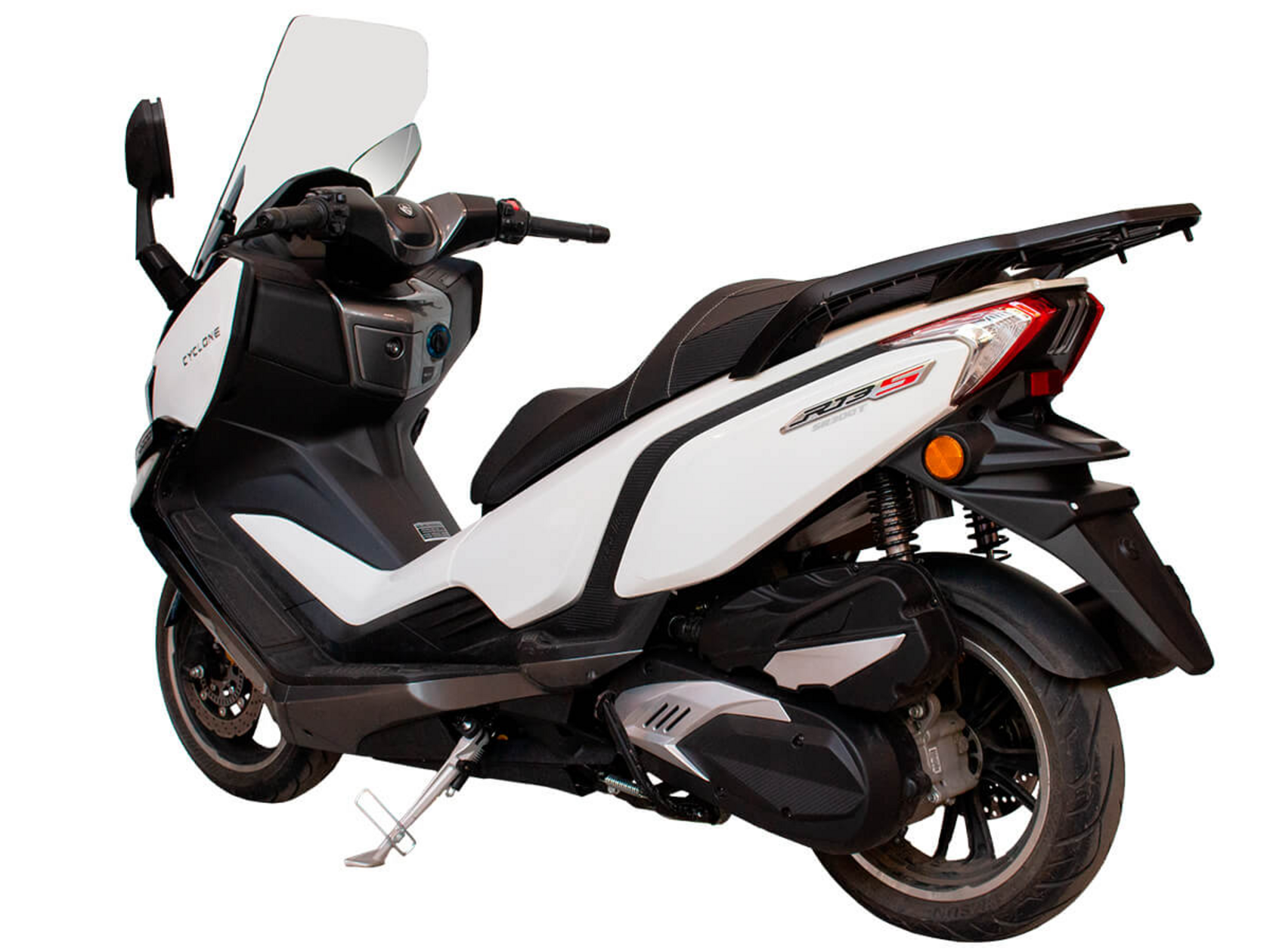 CYCLONE RT3S (SR300T) – городской максискутер, сочетающий в себе мощный двигатель, богатую компоновку и изысканный современный дизайн.Силовая установка представляет собой одноцилиндровый четырёхтактный двигатель объёмом 289 см3 имеет мощность 25 л.с. при 7500 об/мин. Максимальный крутящий момент достигается на 6000 об/мин и составляет 26,5 Н·м. Эти показатели позволяют RT3S по скоростным характеристикам конкурировать не только со скутерами, но и со среднекубатурными мотоциклами.Инжекторный впрыск топлива с блоком управления BOSCH увеличивает топливную экономичность, а также позволяет добиться высокой приёмистости и неприхотливости агрегата. Жидкостная система охлаждения не допустит перегрева двигателя даже при самом агрессивном вождении.На скутер установлен вариатор, который обеспечивает динамичную езду как в условиях городских пробок, так и на скоростных автострадах.Колёса скутера имеют литые диски диаметром 14 и 15 дюймов. Колёса обуты в бескамерные покрышки TIMSUN. Клиренс скутера составляет 155 мм. Подвеска представлена классической телескопической вилкой спереди и двумя газонаполненными амортизаторами сзади. Ход передней подвески составляет 129,5 мм, задней – 97,5 мм.Сухой вес скутера составляет 202 кг. Эффективное и безопасное замедление с любых скоростей обеспечивают гидравлические дисковые тормоза с ABS фирмы BOSCH спереди и сзади.Объём топливного бака этой модели – 17 литров.Модель имеет два видеорегистратора, электрорегулируемое ветровое стекло, подсветку пультов, возможность бесключевого доступа, датчики давления в шинах и USB-порт.Скутер сочетает в себе отличные технические характеристики, комфорт и надёжность, что позволяет вам ощутить настоящую свободу и всегда быть в ритме мегаполиса.