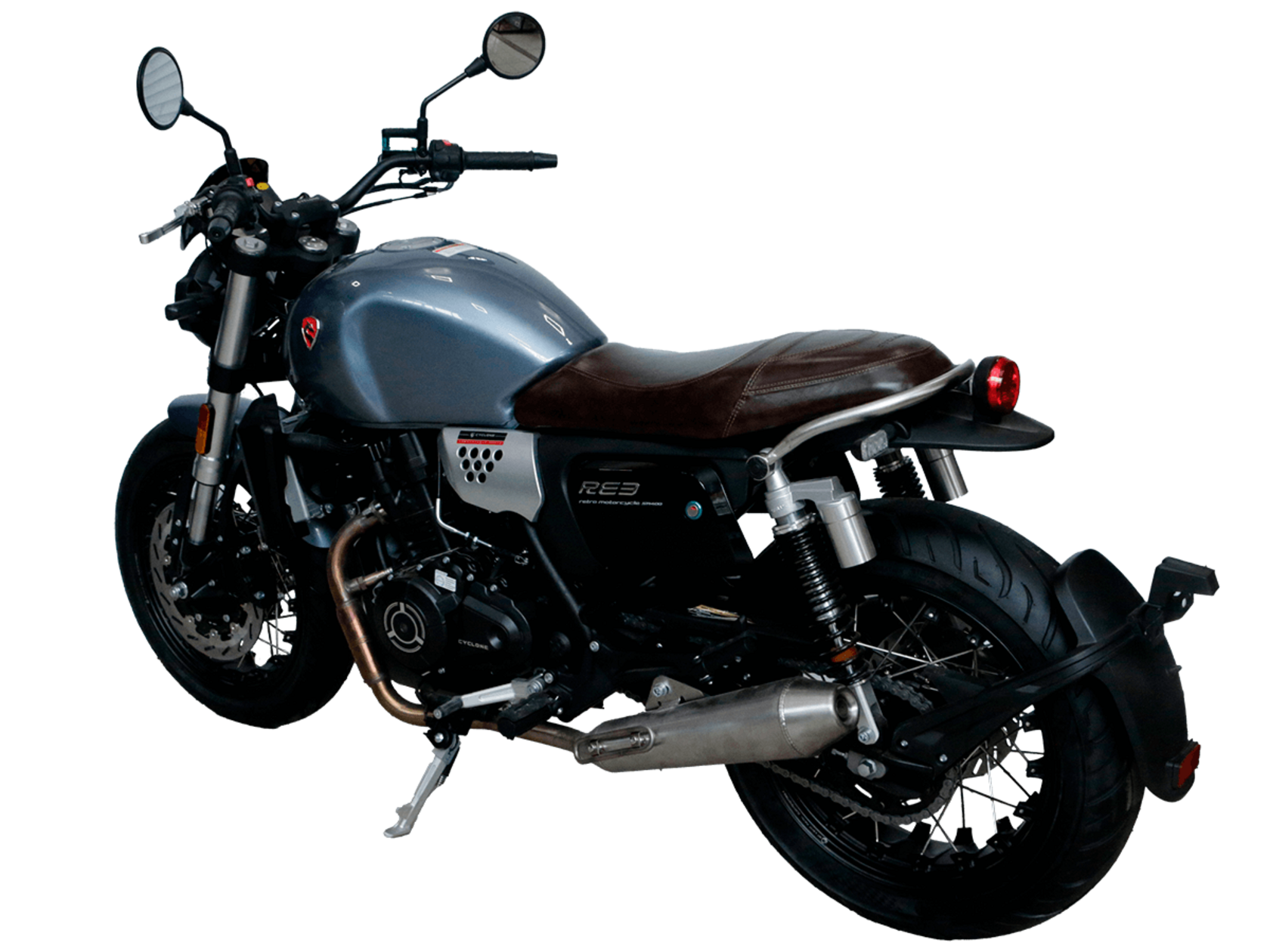 CYCLONE RE3 (SR400) – классик, в котором подчёркнутая простота объединяется с современными технологиями.Двухцилиндровый четырёхтактный двигатель объёмом 401 см3 выдаёт 43 л.с. на 9500 об/мин. Максимальный крутящий момент достигается на 8000 об/мин и составляет 34 Н·м. Инжекторный впрыск топлива с инжектором BOSCH увеличивает топливную экономичность, а также позволяет добиться высокой приёмистости и неприхотливости агрегата. Жидкостная система охлаждения не допустит перегрева двигателя даже при самом агрессивном вождении. На мотоцикл установлена 6-ступенчатая механическая коробка передач.Максимальная скорость мотоцикла составляет 140 км/ч.RE3 оснащён классическими спицованными колёсами диаметром 17 дюймов. Колёса обуты в бескамерные покрышки TIMSUN. С неровностями дороги эффективно справляются регулируемая телескопическая вилка перевёрнутого типа спереди и маятник с двумя амортизаторами сзади. Ход передней подвески составляет 110 мм, задней – 81 мм. Эффективное и безопасное замедление с любых скоростей обеспечивают гидравлические дисковые тормоза с ABS спереди и сзади.Клиренс мотоцикла составляет 145 мм. Объём топливного бака – 19 л. Снаряжённая масса – 186 кг.Из дополнительного оборудования можно выделить USB-порт, подсветку пультов и датчики давления в шинах.Мотоцикл сочетает в себе отличные технические характеристики, комфорт и надёжность, что позволяет вам ощутить настоящую свободу на любой дороге.