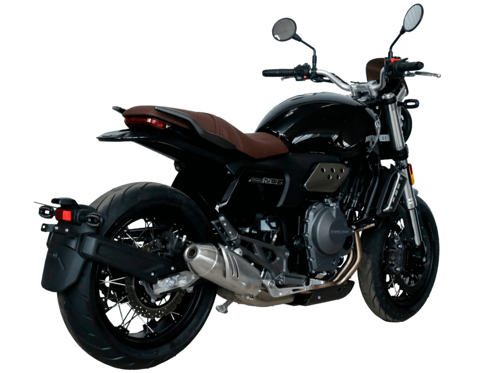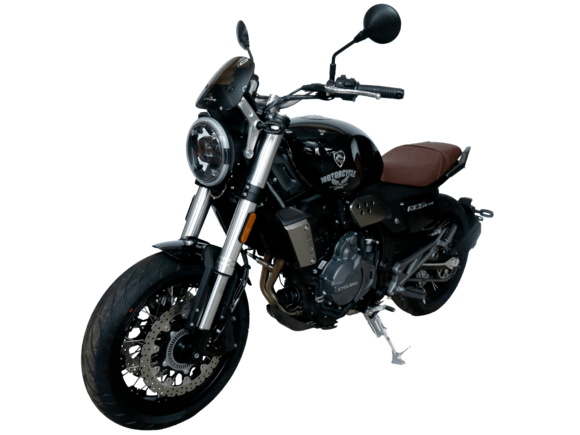 CYCLONE RE5 (SR600) – классик, в котором брутальная простота объединяется с современными технологиями. Данная модель является самой крупнокубатурной среди классических мотоциклов компании CYCLONE.Двухцилиндровый четырёхтактный двигатель объёмом 550 см3 выдаёт 60 л.с. на 8500 об/мин. Максимальный крутящий момент достигается на 6500 об/мин и составляет 55 Н·м. Инжекторный впрыск топлива с блоком управления BOSCH увеличивает топливную экономичность, а также позволяет добиться высокой приёмистости и неприхотливости агрегата. Жидкостная система охлаждения не допустит перегрева двигателя даже при самом агрессивном вождении. На мотоцикл установлена 6-ступенчатая механическая коробка передач.Максимальная скорость мотоцикла составляет 170 км/ч.RE5 оснащён классическими спицевыми колёсами диаметром 17 дюймов. Колёса обуты в бескамерные покрышки от легендарной фирмы PIRELLI. С неровностями дороги эффективно справляются телескопическая вилка перевёрнутого типа спереди и маятник с моноамортизатором сзади. Ход передней подвески составляет 120 мм, задней – 50 мм. Оба компонента подвески являются регулируемыми. Эффективное и безопасное замедление с любых скоростей обеспечивают гидравлические дисковые тормоза с ABS спереди и сзади. Тормозные системы произведены известной испанской фирмой J.JUAN (входящей в легендарный холдинг BREMBO).Клиренс мотоцикла составляет 155 мм. Объём топливного бака – 20 л. Снаряжённая масса – 204 кг.Из дополнительного оборудования можно выделить USB-порт и датчики давления в шинах.Мотоцикл сочетает в себе отличные технические характеристики, комфорт и надёжность, что позволяет вам ощутить настоящую свободу на любой дороге.