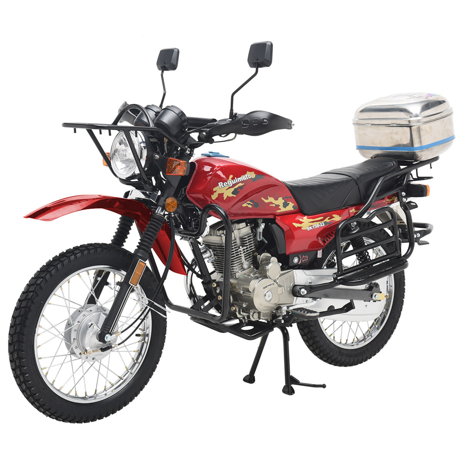Мотоцикл Regulmoto SK 150-22 – классический «дорожник» с надежным и экономичным малокубатурным двигателем. Данная модель изготавливается на собственных мощностях крупного китайского производителя Senke.Несмотря на классический внешний вид Regulmoto SK 150-22 отличается достаточно интересным и продуманным дизайном. В раме мотоцикла установлен одноцилиндровый 4-тактник с воздушным охлаждением с рабочим объемом в 149 см3. Двигатель можно запускать как кнопкой электростартера, так и при помощи традиционного кик-стартера. В целом байк выглядит лаконичным и современным – еще одной приметой актуальных трендов стали спицованные диски переднего 18-дюймового и заднего 18-дюймового колес. Характерная для «дорожников» подвеска представлена телескопической вилкой спереди и двумя амортизаторами сзади.Широкое комфортное сиденье и вместительный бак Regulmoto SK 150-22 недвусмысленно указывают на назначение мотоцикла, окончательную ясность вносят багажник, складывающиеся пассажирские подножки и наличие мощной центральной подножки. Безопасность эксплуатации на дорогах общего пользования обеспечивают обязательный комплект зеркал заднего вида и светового оборудования, включающего фару головного света, светодиодные поворотники и стоп-сигнал. Этот мотоцикл станет отличным выбором в качестве транспортного средства на каждый день и позволит своему обладателю с комфортом решать широкий круг повседневных задач.