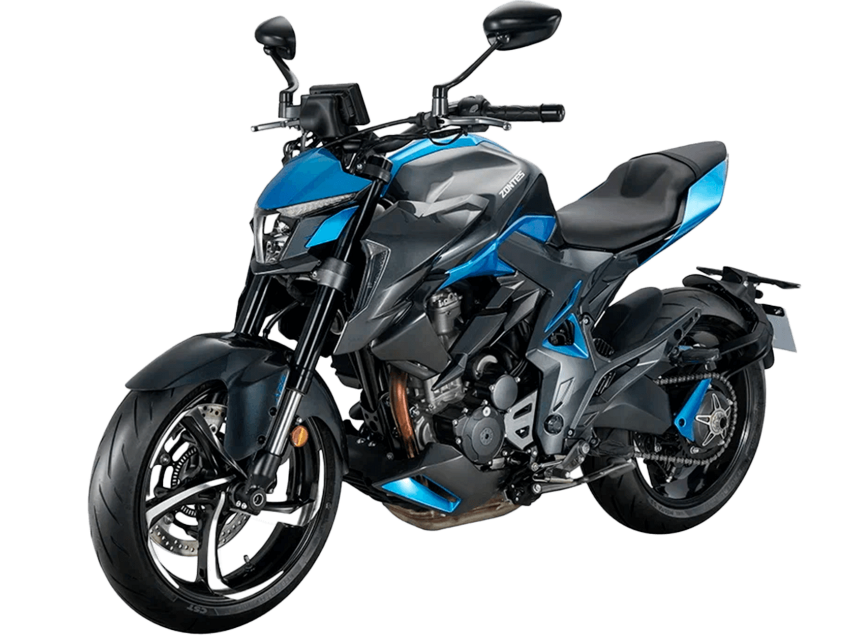 Мотоцикл ZONTES ZT350-R1 – современный нейкед со стремительным и дерзким дизайном. Хорошо подходит как для поездок в городской среде и маневрирования в межрядье.Силовая установка представлена одноцилиндровым 4-тактным двигателем ZT184MP с 4 клапанами и 2 верхними распредвалами. Двигатель имеет объём 348 см³ и обеспечивает мощность в 39 л.с. Оснащён инжектором BOSCH и системой жидкостного охлаждения. Механическая коробка передач имеет 6 ступеней и схему 1-N-2-3-4-5-6. Запуск двигателя осуществляется с помощью бесключевого доступа.Ёмкость топливного бака 15 литров.Колёса представлены литыми алюминиевыми дисками диаметром 17 дюймов. На мотоцикл установлены датчики давления в шинах, показатели от которых выводятся на приборную панель. Для подвески спереди используется телескопическая вилка, сзади – моноамортизатор. Гидравлические дисковые тормоза произведены испанской компанией J.JUAN, входящей в холдинг BREMBO.Для освещения используется яркая LED-оптика, а приборная панель представлена цифровым дисплеем. Рычаги тормоза, сцепления и лапки КПП можно отрегулировать. Имеется 2 USB-порта.Габариты мотоцикла 2030х795х1120 мм. Колёсная база 1390 мм. Высота по седлу 795 мм. Вес 165 кг.